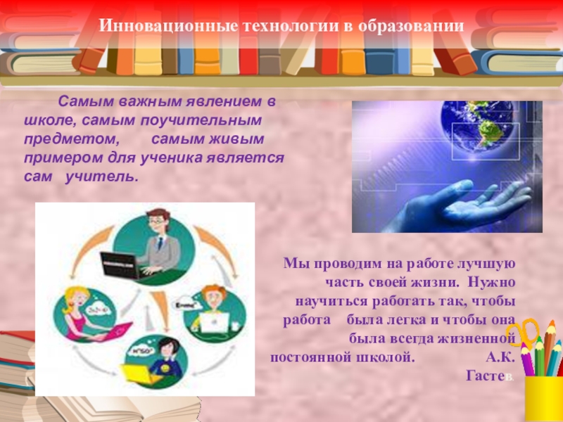 Мы проводим на работе лучшую часть своей жизни. Нужно научиться работать так, чтобы работа была легка и чтобы она была всегда жизненной постоянной школой. А.К.Гастев.