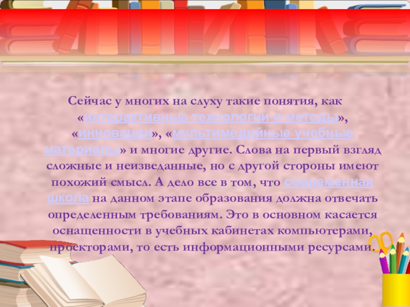 методы», «инновации», «мультимедийные учебные материалы» и многие другие. Слова на первый взгляд сложные и неизведанные, но с другой стороны имеют похожий смысл. А дело все в том, что современная школа на данном этапе образования должна отвечать определенным требованиям. Это в основном касается оснащенности в учебных кабинетах компьютерами, проекторами, то есть информационными ресурсами.