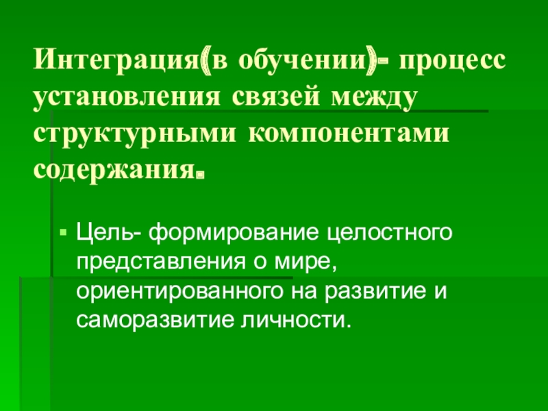 Интеграция(в обучении)- процесс установления связей между структурными компонентами содержания.Цель- формирование целостного представления о мире, ориентированного на развитие