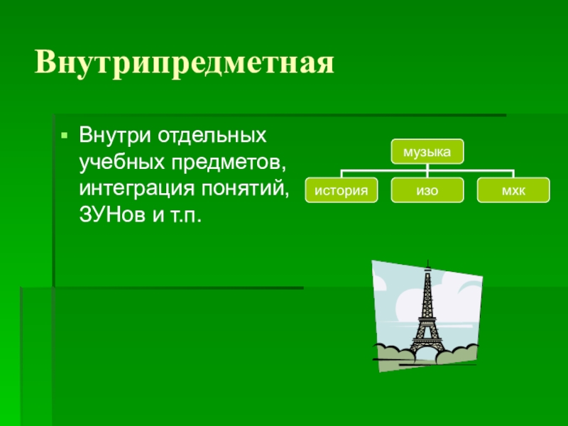 ВнутрипредметнаяВнутри отдельных учебных предметов, интеграция понятий, ЗУНов и т.п.
