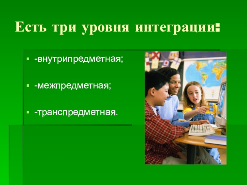 Есть три уровня интеграции:-внутрипредметная;-межпредметная;-транспредметная.
