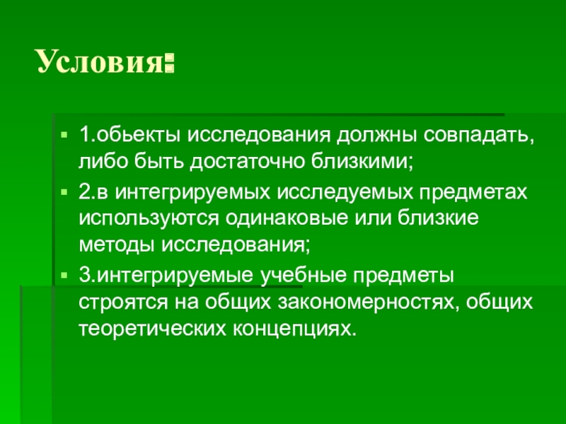 Условия:1.обьекты исследования должны совпадать, либо быть достаточно близкими;2.в интегрируемых исследуемых предметах используются одинаковые или близкие методы исследования;3.интегрируемые