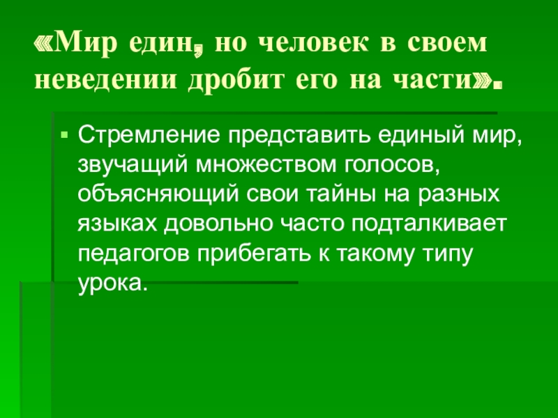 «Мир един, но человек в своем неведении дробит его на части».Стремление представить единый мир, звучащий множеством голосов, объясняющий свои тайны на разных языках довольно часто подталкивает педагогов прибегать к такому типу урока.