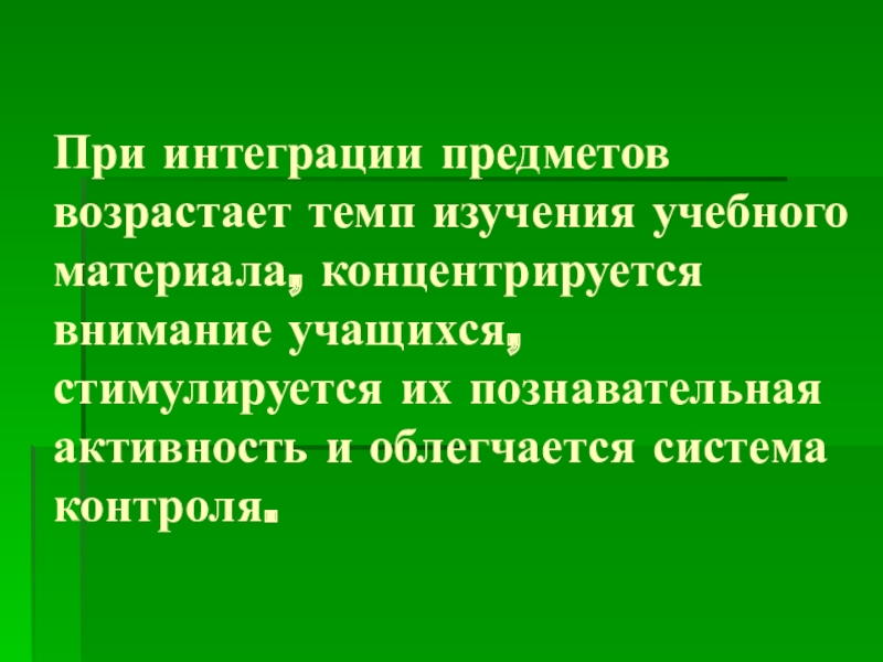 Слайд 9При интеграции предметов возрастает темп изучения учебного материала, концентрируется внимание учащихся,