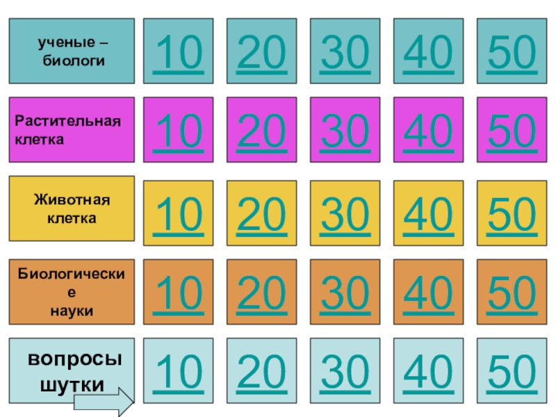 ученые – биологи1020304050РастительнаяклеткаЖивотнаяклеткаБиологическиенауки вопросы шутки1020304050102030405010203040501020304050