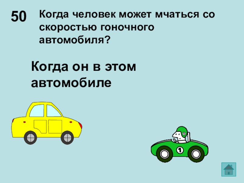 50Когда человек может мчаться со скоростью гоночного автомобиля?Когда он в этом автомобиле