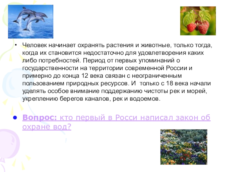 недостаточно для удовлетворения каких либо потребностей. Период от первых упоминаний о государственности на территории современной России и примерно до конца 12 века связан с неограниченным пользованием природных ресурсов. И только с 18 века начали уделять особое внимание поддержанию чистоты рек и морей, укреплению берегов каналов, рек и водоемов.