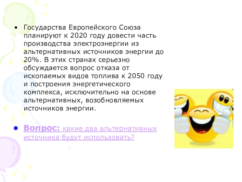 Слайд 13Государства Европейского Союза планируют к 2020 году довести часть производства электроэнергии