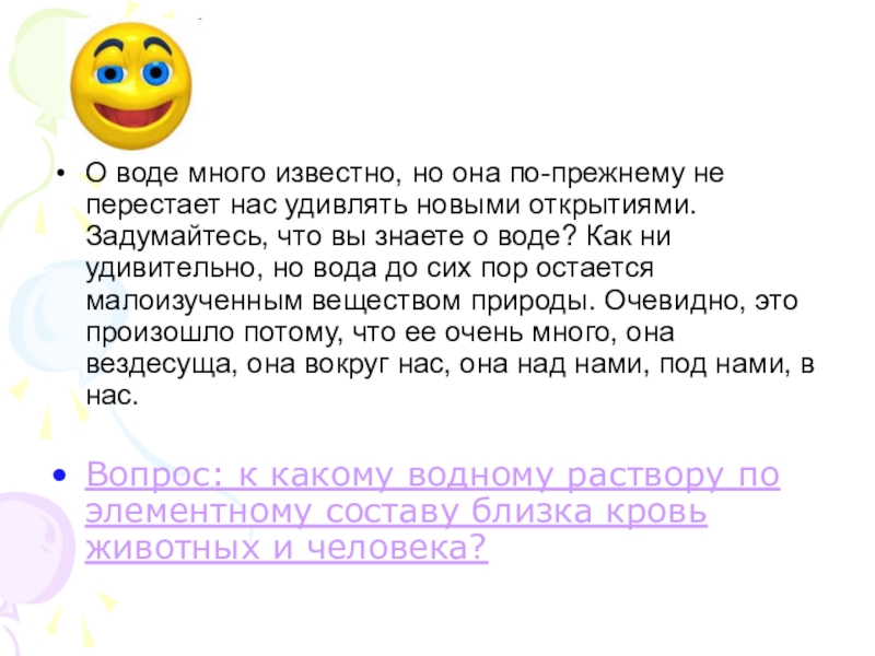 новыми открытиями. Задумайтесь, что вы знаете о воде? Как ни удивительно, но вода до сих пор остается малоизученным веществом природы. Очевидно, это произошло потому, что ее очень много, она вездесуща, она вокруг нас, она над нами, под нами, в нас.