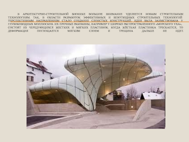 Слайд 6 В архитектурно-строительной бионике большое внимание уделяется новым строительным технологиям. Так, в