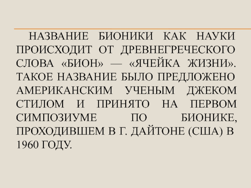 жизни». Такое название было предложено американским ученым Джеком Стилом и принято на Первом симпозиуме по бионике, проходившем в г. Дайтоне (США) в 1960 году.