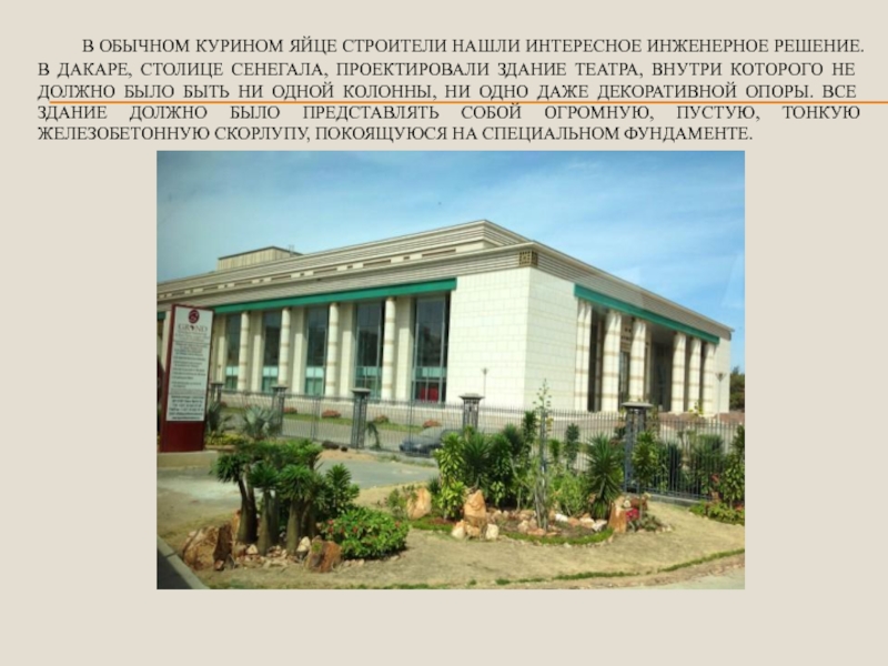 Слайд 7 В обычном курином яйце строители нашли интересное инженерное решение. В Дакаре,
