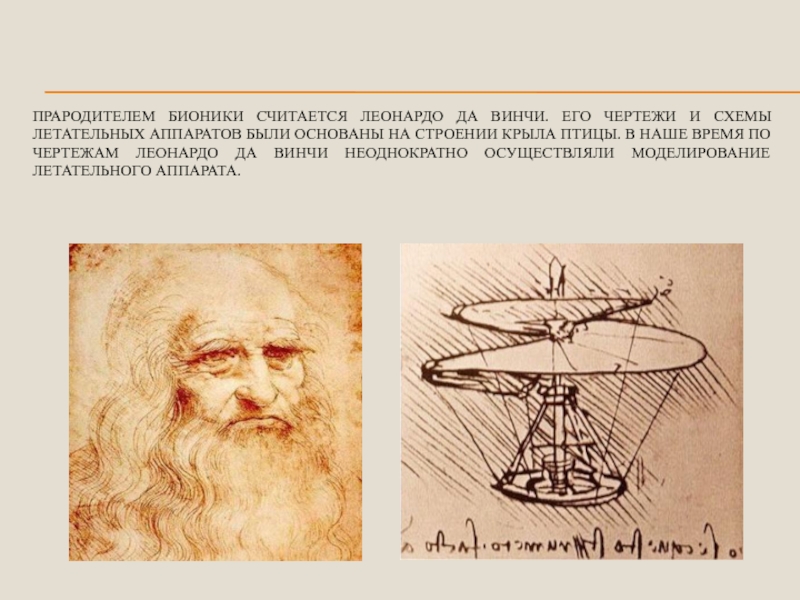Слайд 4Прародителем бионики считается Леонардо да Винчи. Его чертежи и схемы летательных