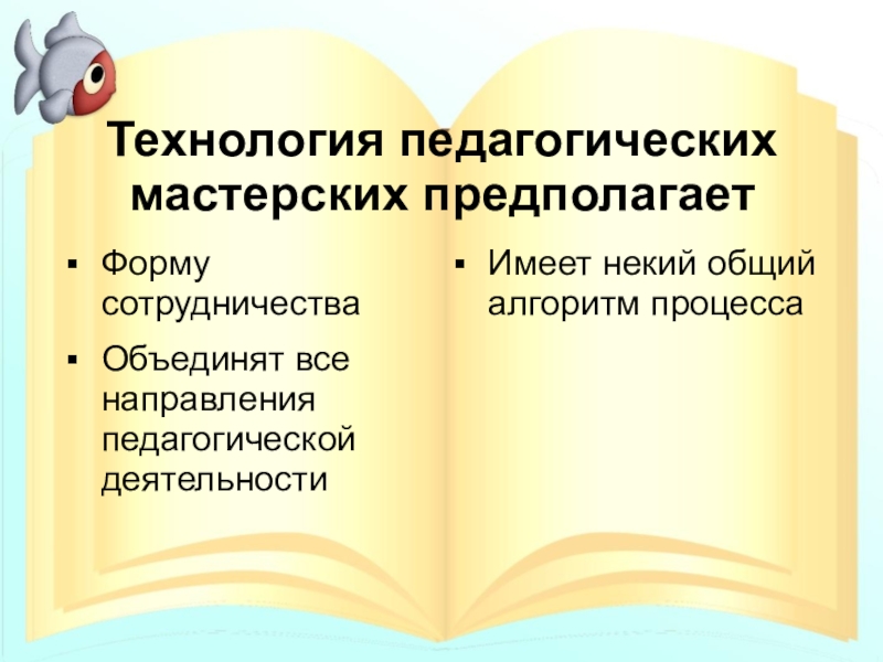 Технология педагогических мастерских предполагаетФорму сотрудничестваОбъединят все направления педагогической деятельностиИмеет некий общий алгоритм процесса