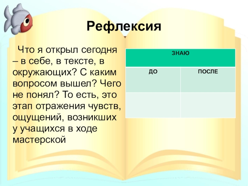 окружающих? С каким вопросом вышел? Чего не понял? То есть, это этап отражения чувств, ощущений, возникших у учащихся в ходе мастерской