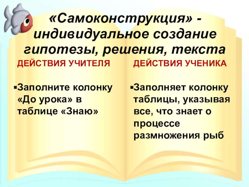 «Самоконструкция» - индивидуальное создание гипотезы, решения, текста ДЕЙСТВИЯ УЧИТЕЛЯЗаполните колонку «До урока» в таблице «Знаю»  ДЕЙСТВИЯ