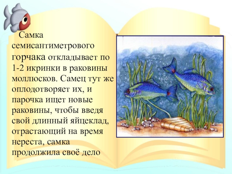 Самка семисантиметрового горчака откладывает по 1-2 икринки в раковины моллюсков. Самец тут же оплодотворяет их,