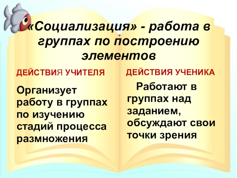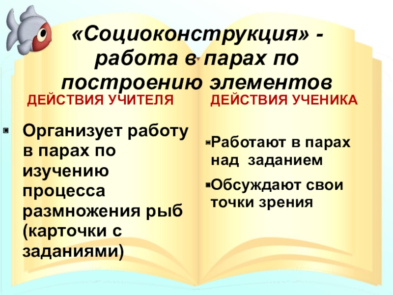 «Социоконструкция» - работа в парах по построению элементов ДЕЙСТВИЯ УЧИТЕЛЯОрганизует работу в парах по изучению процесса размножения
