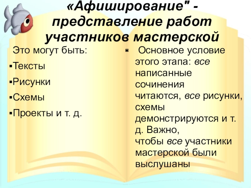 Основное условие этого этапа: все написанные сочинения читаются, все рисунки, схемы демонстрируются и т.д. Важно, чтобы все участники мастерской были выслушаны