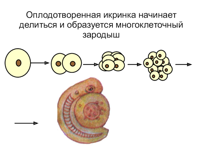 Слайд 32Оплодотворенная икринка начинает делиться и образуется многоклеточный зародыш