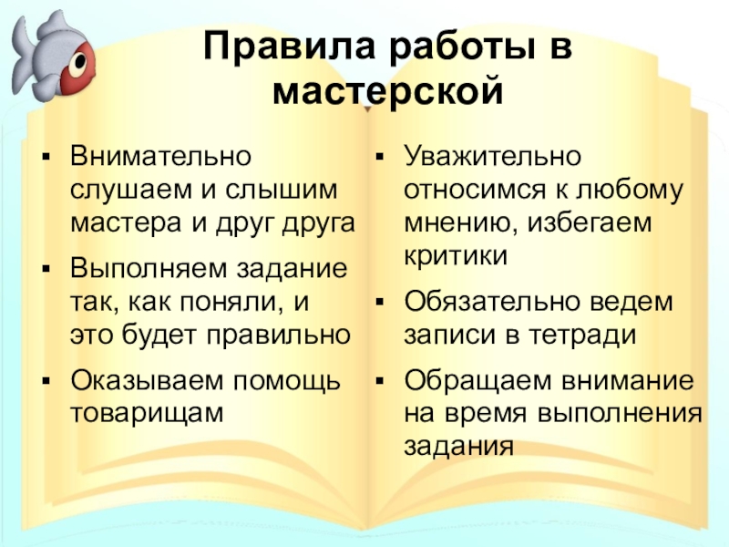 Правила работы в мастерскойВнимательно слушаем и слышим мастера и друг другаВыполняем задание так, как поняли, и это