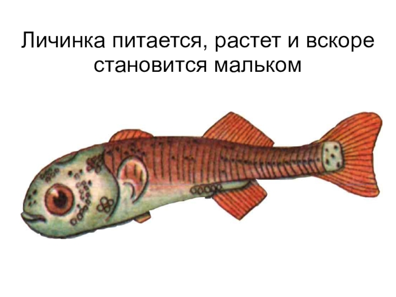 Слайд 34Личинка питается, растет и вскоре становится мальком