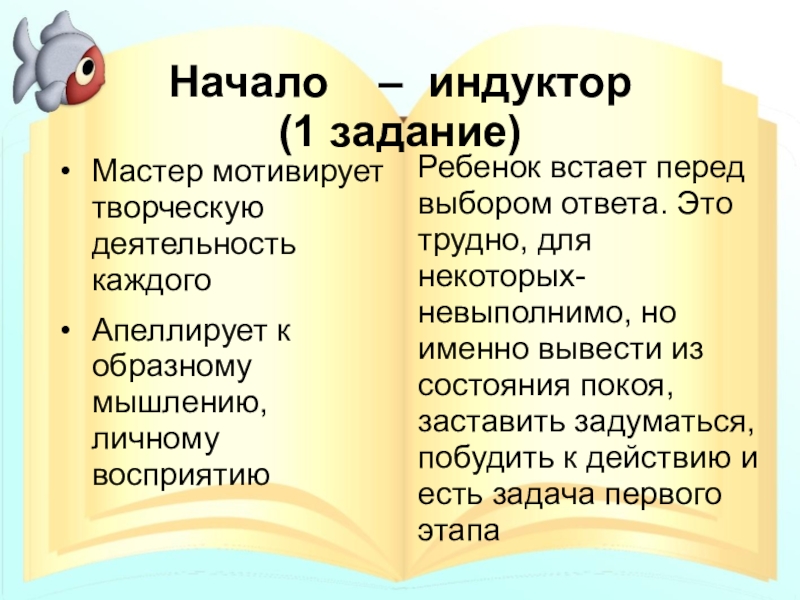 Начало  – индуктор  (1 задание)Мастер мотивирует творческую деятельность каждого Апеллирует к образному мышлению, личному восприятию