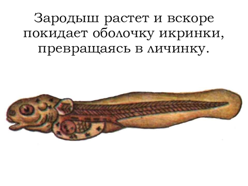 Слайд 33Зародыш растет и вскоре покидает оболочку икринки, превращаясь в личинку.