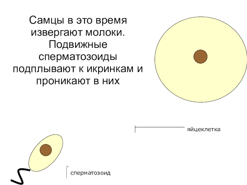 Слайд 31Самцы в это время извергают молоки. Подвижные сперматозоиды подплывают к икринкам