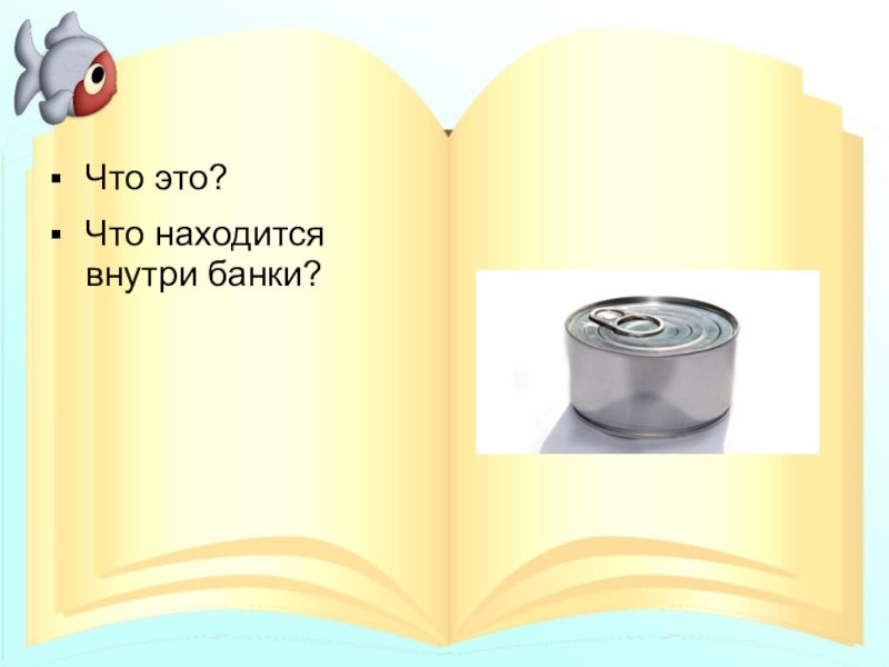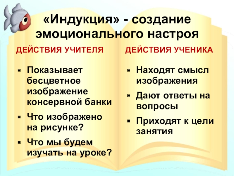 «Индукция» - создание эмоционального настроя ДЕЙСТВИЯ УЧИТЕЛЯПоказывает бесцветное изображение консервной банкиЧто изображено на рисунке? Что мы будем