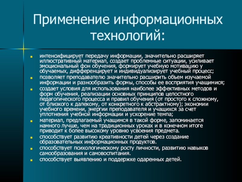 интенсифицирует передачу информации, значительно расширяет иллюстративный материал, создает проблемные