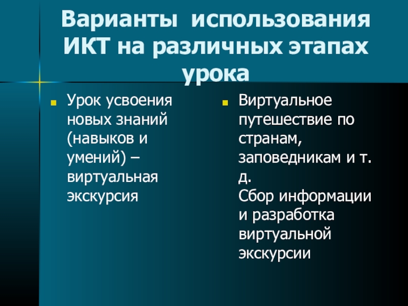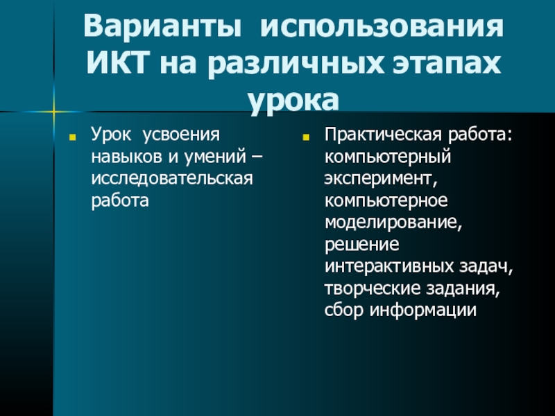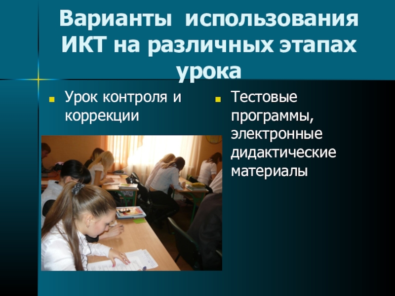 Слайд 17Варианты использования ИКТ на различных этапах урока