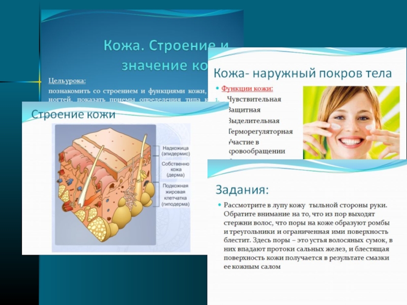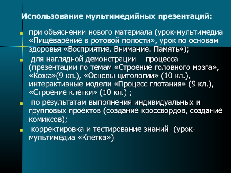 для наглядной демонстрации процесса (презентации по темам «Строение головного мозга», «Кожа»(9 кл.), «Основы цитологии» (10 кл.), интерактивные модели «Процесс глотания» (9 кл.), «Строение клетки» (10 кл.) ;