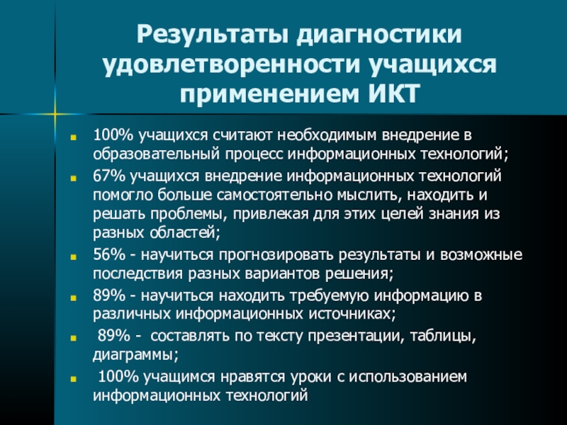 Слайд 31Результаты диагностики удовлетворенности учащихся применением ИКТ