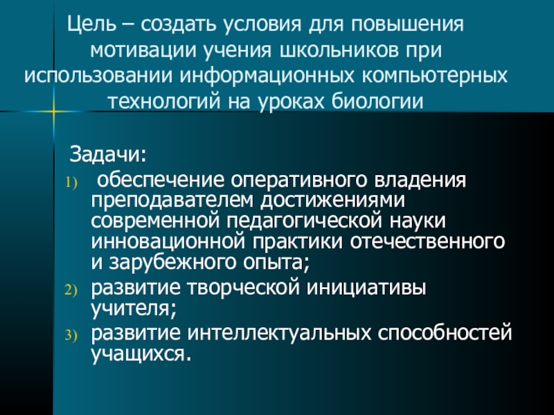 Слайд 6Цель – создать условия для повышения мотивации учения школьников при использовании