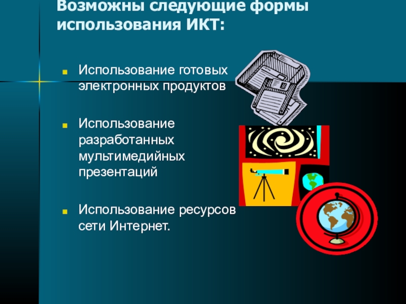 Слайд 10Возможны следующие формы использования ИКТ: