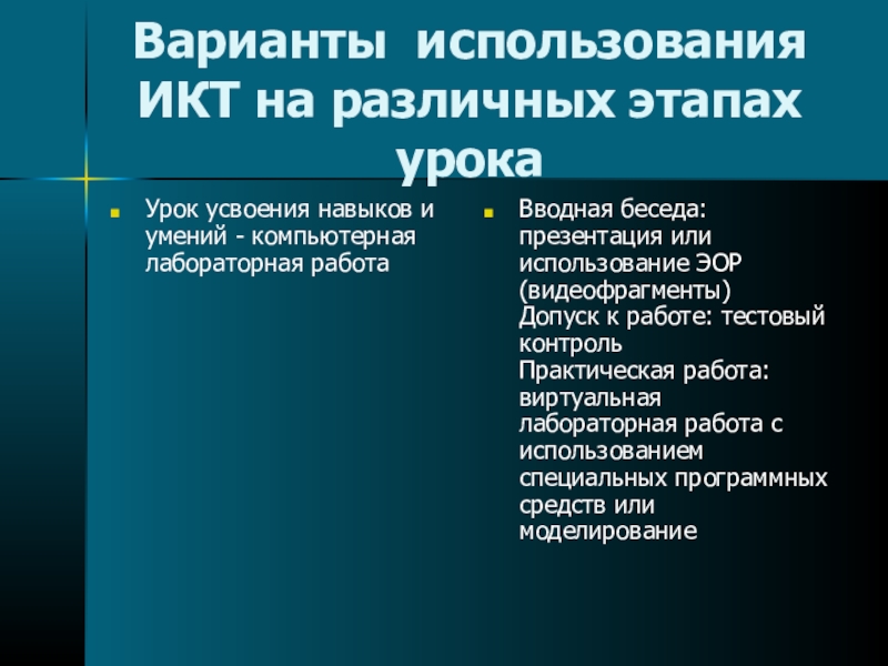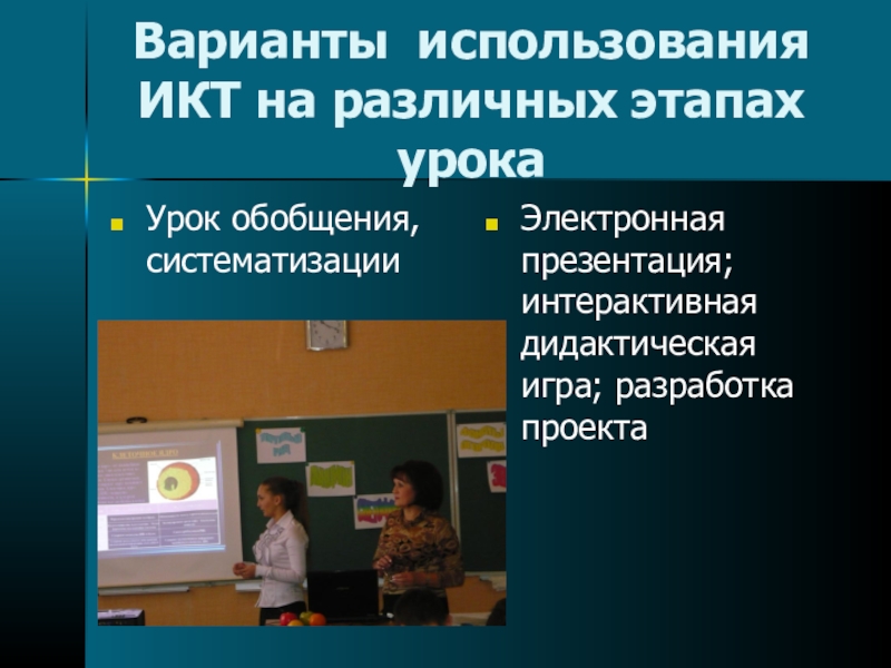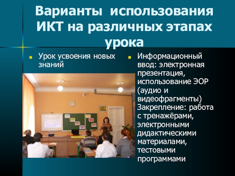 Слайд 12Варианты использования ИКТ на различных этапах урока