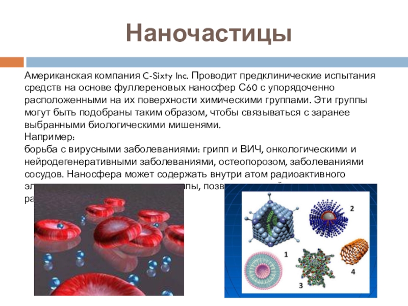 Наночастицы Американская компания C-Sixty Inc. Проводит предклинические испытания средств на основе фуллереновых наносфер С60 с упорядоченно расположенными