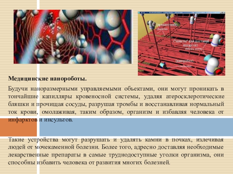 Медицинские нанороботы.Будучи наноразмерными управляемыми объектами, они могут проникать в тончайшие капилляры кровеносной системы, удаляя атеросклеротические бляшки и