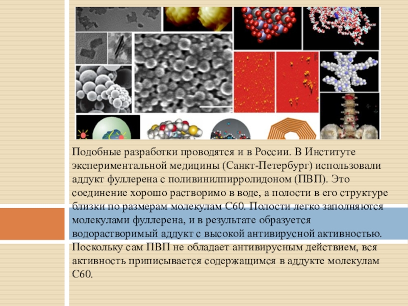 использовали аддукт фуллерена с поливинилпирролидоном (ПВП). Это соединение хорошо растворимо в воде, а полости в его структуре близки по размерам молекулам С60. Полости легко заполняются молекулами фуллерена, и в результате образуется водорастворимый аддукт с высокой антивирусной активностью. Поскольку сам ПВП не обладает антивирусным действием, вся активность приписывается содержащимся в аддукте молекулам С60.