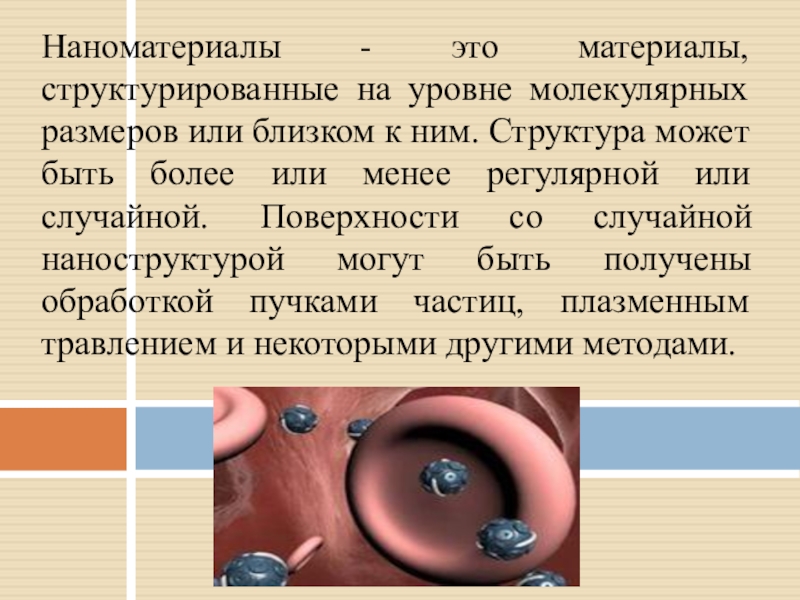 Наноматериалы - это материалы, структурированные на уровне молекулярных размеров или близком к ним. Структура может быть более или менее регулярной или случайной. Поверхности со случайной наноструктурой могут быть получены обработкой пучками частиц, плазменным травлением и некоторыми