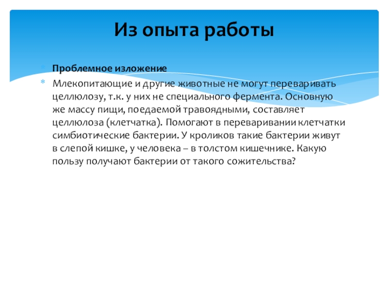 них не специального фермента. Основную же массу пищи, поедаемой травоядными, составляет целлюлоза (клетчатка). Помогают в переваривании клетчатки симбиотические бактерии. У кроликов такие бактерии живут в слепой кишке, у человека – в толстом кишечнике. Какую пользу получают бактерии от такого сожительства?