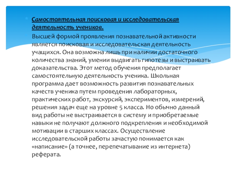 поисковая и исследовательская деятельность учащихся. Она возможна лишь при наличии достаточного количества знаний, умении выдвигать гипотезы и выстраивать доказательства. Этот метод обучения предполагает самостоятельную деятельность ученика. Школьная программа дает возможность развития познавательных качеств ученика путем проведения лабораторных, практических работ, экскурсий, экспериментов, измерений, решения задач еще на уровне 5 класса. Но обычно данный вид работы не выстраивается в систему и приобретаемые навыки не получают должного подкрепления и необходимой мотивации в старших классах. Осуществление исследовательской работы зачастую понимается как «написание» (а точнее, перепечатывание из интернета) реферата.