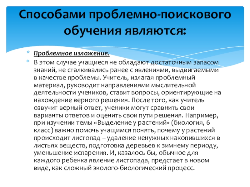 сталкивались ранее с явлениями, выдвигаемыми в качестве проблемы. Учитель, излагая проблемный материал, руководит направлениями мыслительной деятельности учеников, ставит вопросы, ориентирующие на нахождение верного решения. После того, как учитель озвучит верный ответ, ученики могут сравнить свои варианты ответов и оценить свои пути решения. Например, при изучении темы «Выделение у растений» (биология, 6 класс) важно помочь учащимся понять, почему у растений происходит листопад – удаление ненужных накопившихся в листьях веществ, подготовка деревьев к зимнему периоду, уменьшение испарения. И, казалось бы, обычное для каждого ребенка явление листопада, предстает в новом виде, как сложный эколого-биологический процесс.