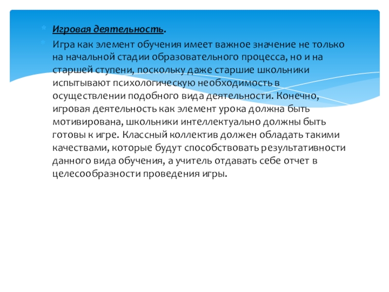 начальной стадии образовательного процесса, но и на старшей ступени, поскольку даже старшие школьники испытывают психологическую необходимость в осуществлении подобного вида деятельности. Конечно, игровая деятельность как элемент урока должна быть мотивирована, школьники интеллектуально должны быть готовы к игре. Классный коллектив должен обладать такими качествами, которые будут способствовать результативности данного вида обучения, а учитель отдавать себе отчет в целесообразности проведения игры.