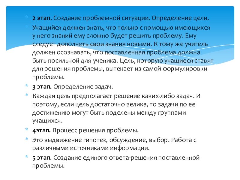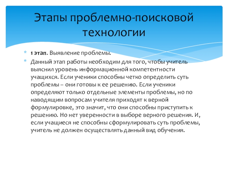 выяснил уровень информационной компетентности учащихся. Если ученики способны четко определить суть проблемы – они готовы к ее решению. Если ученики определяют только отдельные элементы проблемы, но по наводящим вопросам учителя приходят к верной формулировке, это значит, что они способны приступить к решению. Но нет уверенности в выборе верного решения. И, если учащиеся не способны сформулировать суть проблемы, учитель не должен осуществлять данный вид обучения.