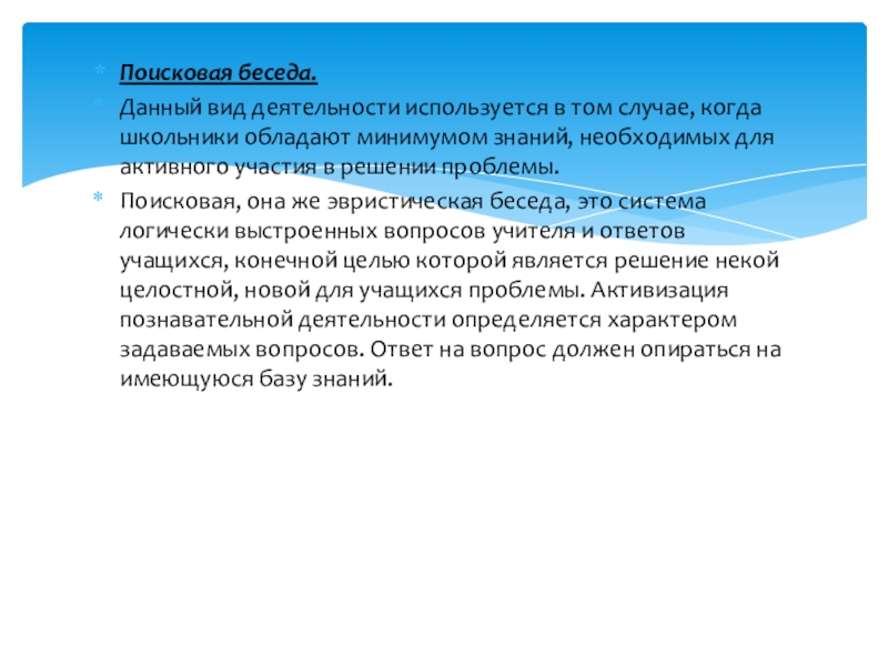 Поисковая, она же эвристическая беседа, это система логически выстроенных вопросов учителя и ответов учащихся, конечной целью которой является решение некой целостной, новой для учащихся проблемы. Активизация познавательной деятельности определяется характером задаваемых вопросов. Ответ на вопрос должен опираться на имеющуюся базу знаний.