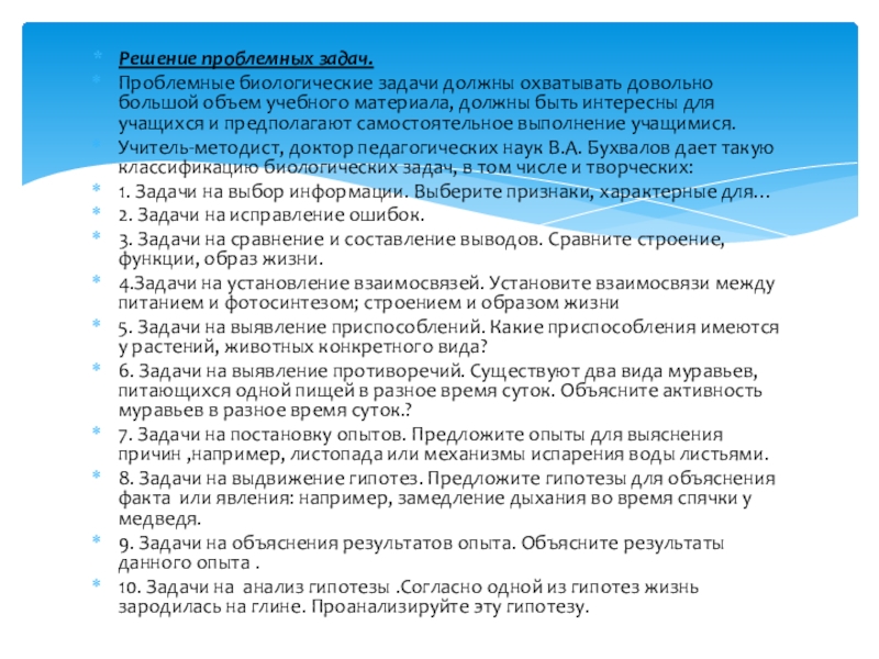 Учитель-методист, доктор педагогических наук В.А. Бухвалов дает такую классификацию биологических задач, в том числе и творческих: