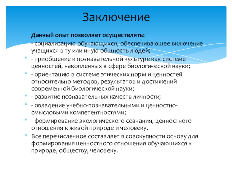 - приобщение к познавательной культуре как системе ценностей, накопленных в сфере биологической науки;