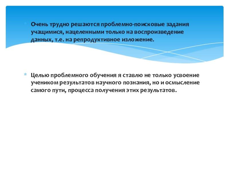 Слайд 6Очень трудно решаются проблемно-поисковые задания учащимися, нацеленными только на воспроизведение данных,
